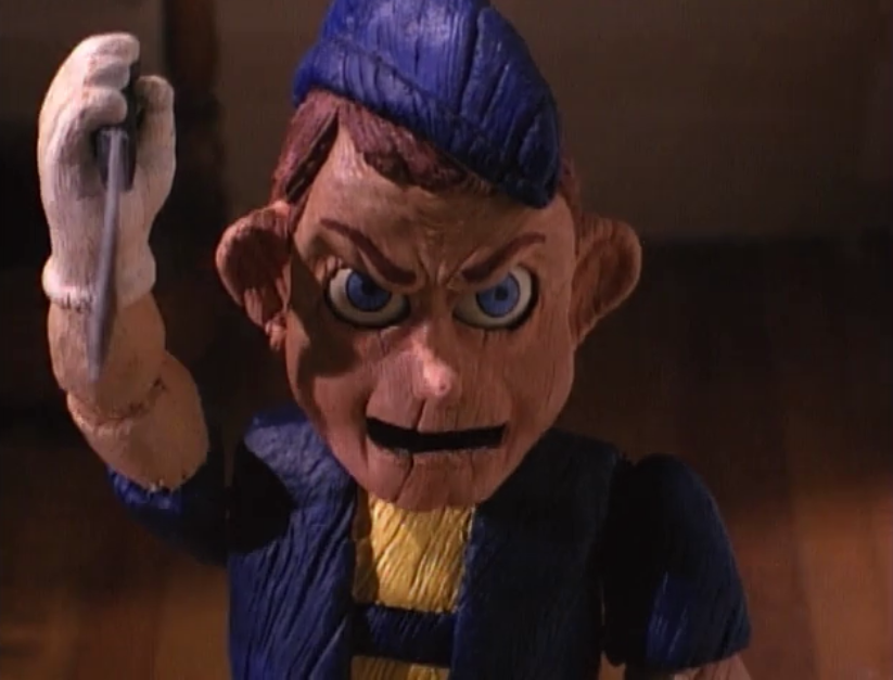 On Netflix, Kevin S. Tenney’s (NIGHT OF THE DEMONS) 1996 film PINOCCHIO’S REVENGE earned the same rating by the powers that be as HOWLING III: THE MARSUPIALS which I’m telling you right now is such a load of horseshit because the latter hardly constitutes as a movie in the first place. Going by genre expectations alone, one suspects that with this film they’re going to be getting a lot of what the above screenshot promises. Indeed, I recalled the VHS cover to this bad boy from the days when Blockbuster still had a designated horror section. At the time, it looked comparable to other contemporaneous “gimmick” pictures like LEPRECHAUN (1993) and JACK FROST (1997) and UNCLE SAM (1996). But what a young fool I was! Tenney shows a remarkable–given the typical budget and classiness of the rest of his resume–knack for restraint and deceptive narrative that one wonders why he didn’t try his hand at a story of this precision again. It has a logline worthy of the 90s, the decade that equated horror films with scary books for adolescents: a lawyer (Rosalind Allen) defending a man who has killed his son acquires the murdered boy’s treasured puppet which her daughter (Brittany Alyse Smith) in turn accidentally receives as a birthday present, prompting an unhealthy relationship to develop in which the young lass begins blaming her new toy for the increasingly violent “accidents” that begin occurring around her. What follows is a surprisingly taut and well-controlled thriller that is always careful to never show its hand even when you’ve become convinced that you’ve seen through it all. Tenney teases out his script with the uncertainty of whether the doll is actually a real murderin’ boy or if it is all a matter of the curly-haired scamp’s delusional mind. The fact that Tenney even squeezes in a brief scene concerning the nature of evil and manages to keep it from sounding really fucking stupid is a sign of a filmmaker who knows how to pull the strings.